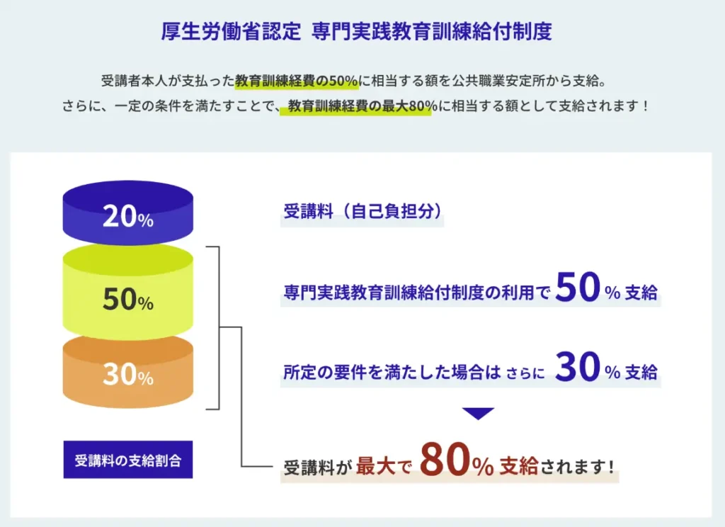 そして、私が受講していた当時はなかったのですが、専門実践教育訓練給付金の指定講座に選ばれ、転職希望者でなくとも、給付金を活用して受講費負担を大幅に下げられるようになっている点もおすすめの理由です。