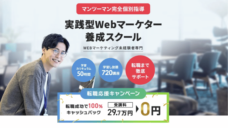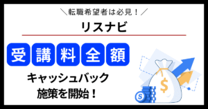 転職希望者向けの全額キャッシュバックキャンペーンも開催しており、条件にはまれば、実質負担ゼロで受講できる点も要チェックです。