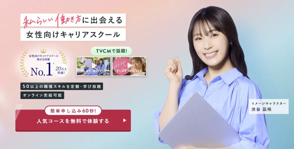 SHElikesは、Webマーケティングだけでなく、Webデザインやライティングなど全50以上の職種スキルが定額で学び放題の、女性向けキャリアスクールです。複数のスキルを自由に組み合わせて学習できるため、キャリアの選択肢を大きく広げられるのが最大の魅力です。