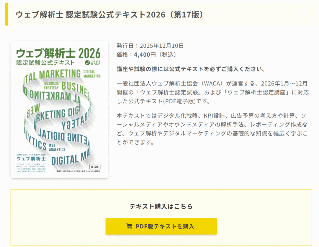 ウェブ解析士協会が発行する最新年度の公式テキストを、ウェブ解析士協会公式HPから「PDF版」で購入する